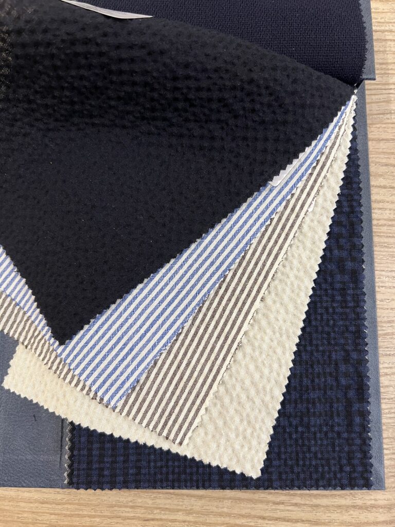 一般的にはコットンで作られるナチュラルな凹凸感が特徴のシアサッカーをウール・ポリエステルでドレスアップ向けに作られた生地です。