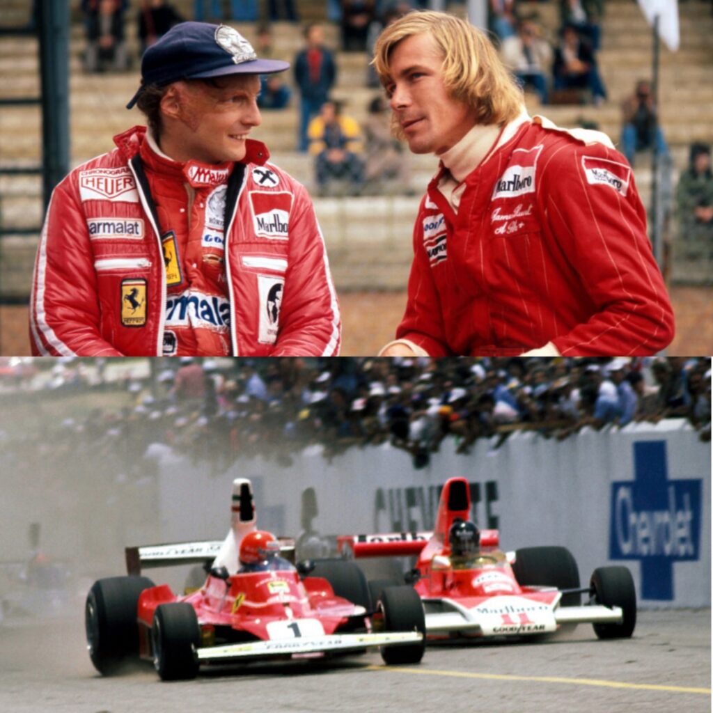 実際のニキ・ラウダ(左)とジェームス・ハント(右) これは事故後の写真ですね。