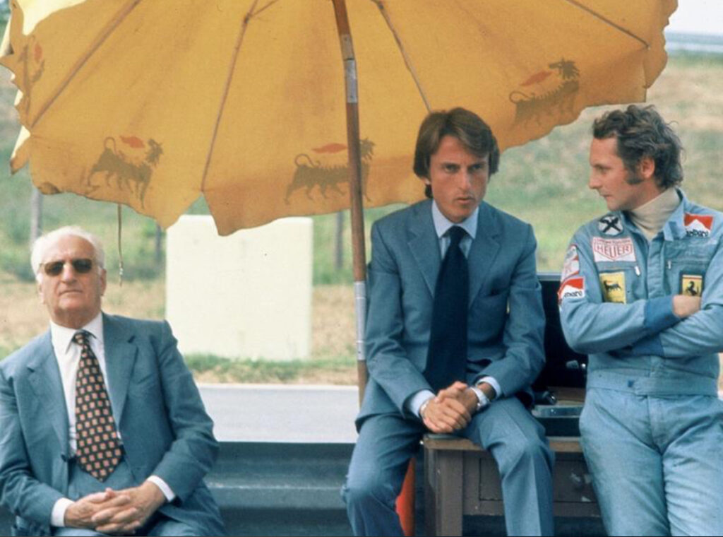 左から:エンツォ・フェラーリ / ルカ・モンテゼーモロ / ニキ・ラウダ 1974年撮影