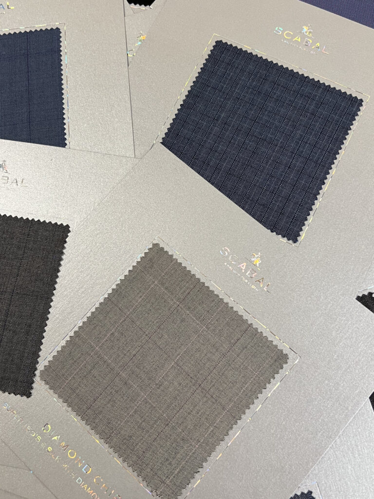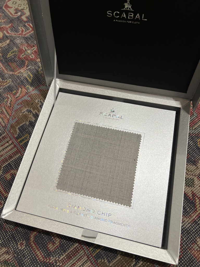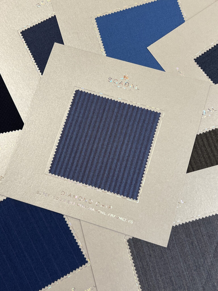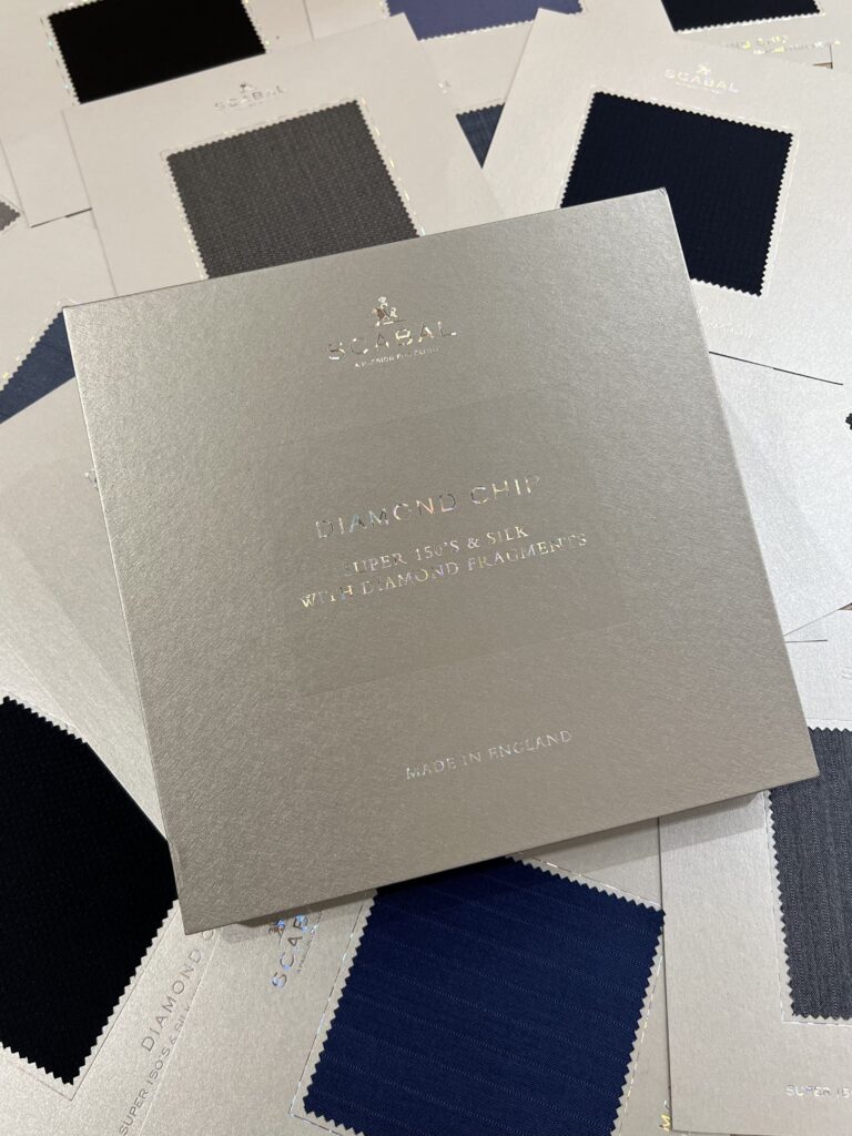 80%スーパー150’sウール(これにはダイヤモンドが組み込まれています。)&20%シルク、スキャバルが所有する、イギリス・ハダースフィールドのミル(織元)で時間を掛けて丁寧に織られます。